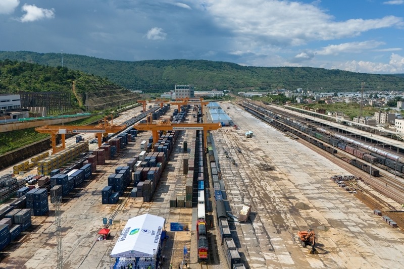 7月4日,“鄭和號(hào)”海公鐵國(guó)際多式聯(lián)運(yùn)班列首發(fā)列車在昆明市騰俊國(guó)際陸港公鐵聯(lián)運(yùn)中心等候發(fā)車。