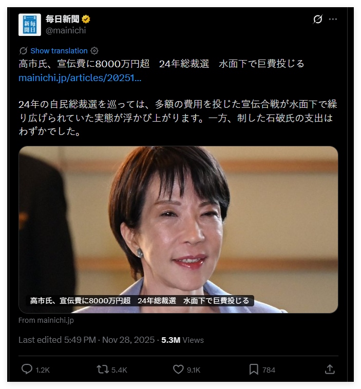 這則新聞的內(nèi)容是,高市早苗在2024年日本自民黨總裁選舉期間,曾瘋狂砸了8384萬(wàn)日元(約381萬(wàn)元人民幣)用于宣傳自己,但最終還是輸給了石破茂,而且石破茂的宣傳開銷僅為42萬(wàn)日元(約1.9萬(wàn)元人民幣)。