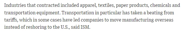 文章指出,美國(guó)制造業(yè)活動(dòng)萎縮的行業(yè)主要包括服裝、紡織品、紙制品、化工產(chǎn)品和運(yùn)輸業(yè)。文章表示,雖然當(dāng)前美國(guó)工廠產(chǎn)量有所增加,但未售出的庫(kù)存卻急劇增加。需求增長(zhǎng)放緩,這在出口市場(chǎng)體現(xiàn)尤為明顯,而受關(guān)稅影響,出口市場(chǎng)的前景更加暗淡。