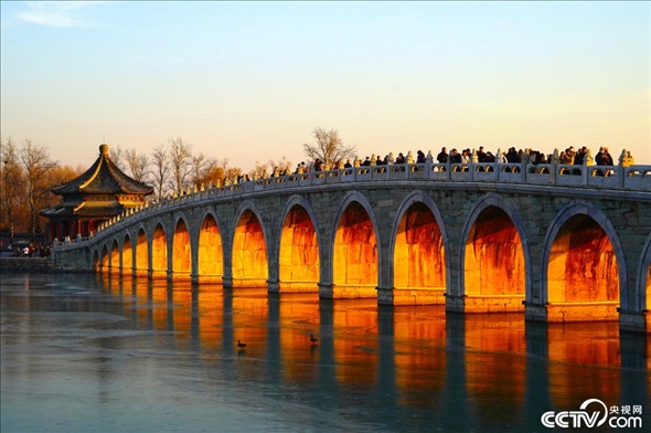 2023年12月3日,北京頤和園,落日余暉穿過(guò)十七孔橋的孔洞,形成“金光穿洞”美景。