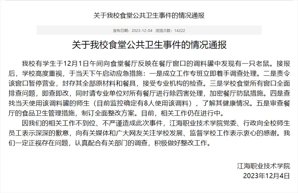 ·揚(yáng)州一高校通報(bào)食堂麻醬罐發(fā)現(xiàn)老鼠:成立專班調(diào)查處理,涉事窗口停業(yè)。