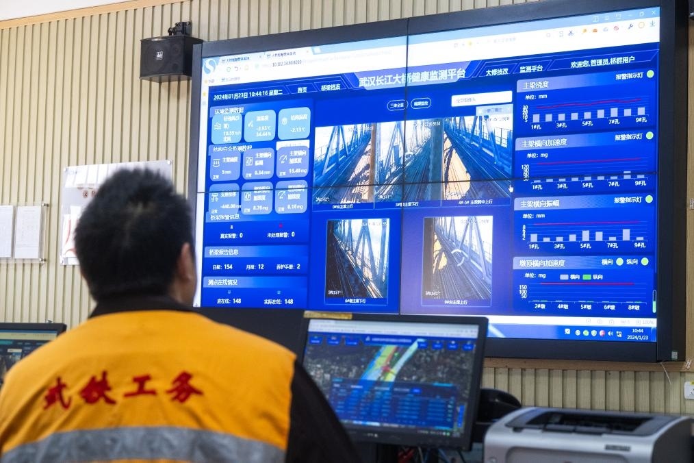 1月23日,武漢長江大橋橋梁車間員工在主控室對武漢長江大橋進(jìn)行監(jiān)測。新華社記者肖藝九 攝