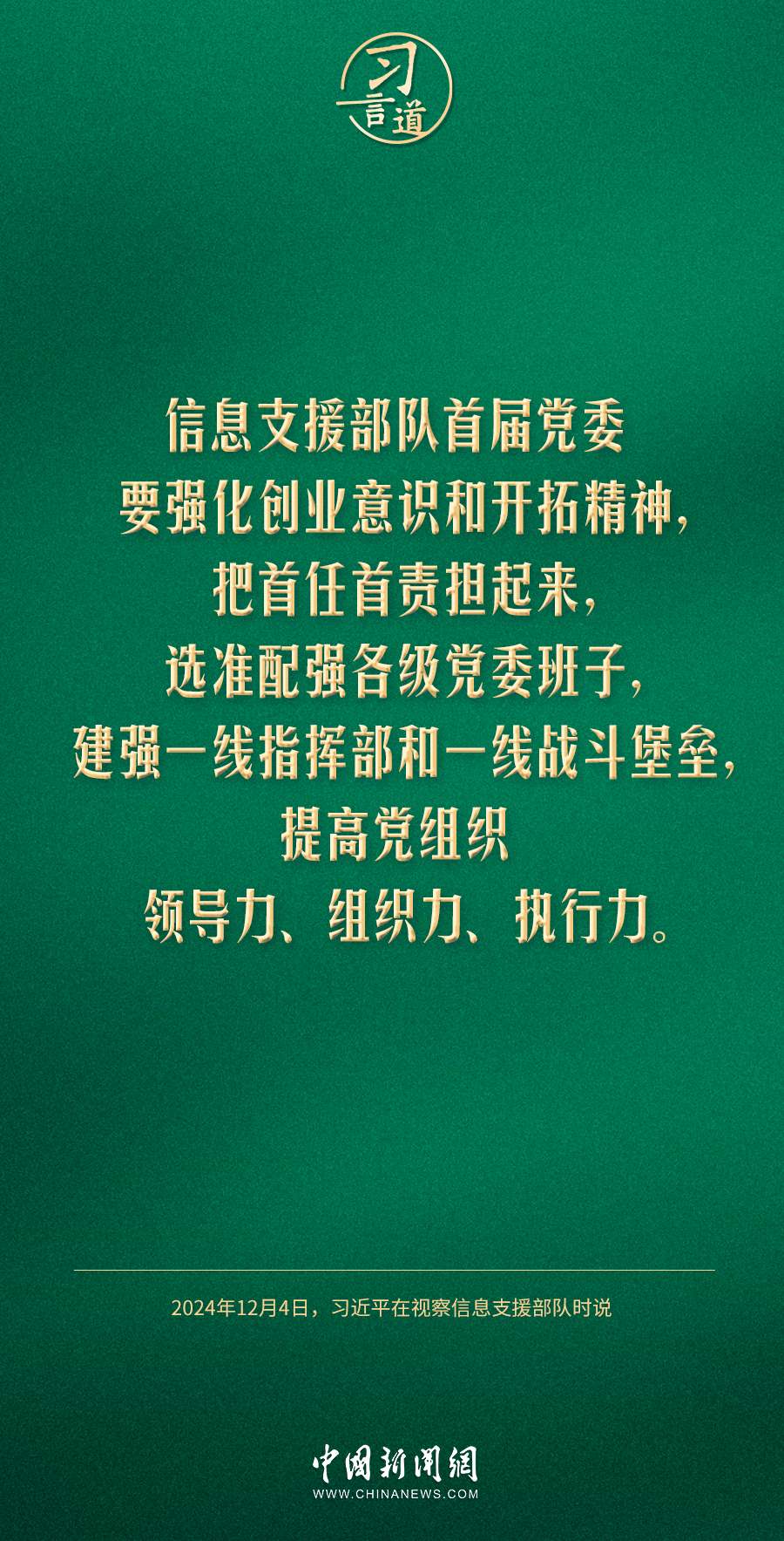 中共中央總書記、國家主席、中央軍委主席習(xí)近平4日視察信息支援部隊,代表黨中央和中央軍委,對信息支援部隊第一次黨代表大會的召開表示熱烈祝賀,向信息支援部隊全體官兵致以誠摯問候。習(xí)近平指出——
