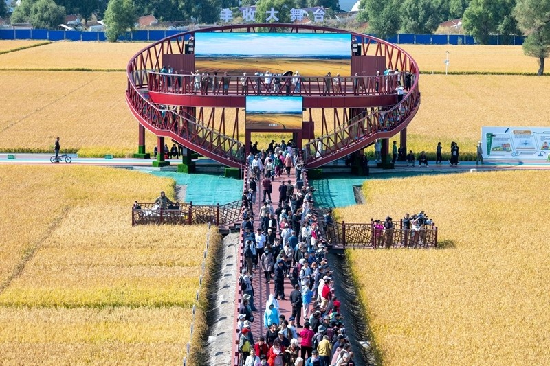 9月23日,2025年中國農(nóng)民豐收節(jié)黑龍江省主場活動在北大荒農(nóng)墾集團閆家崗農(nóng)場稻田藝術公園拉開帷幕,人們歡聚一堂,共享一場同耕耘、共歡歌的豐收盛宴。