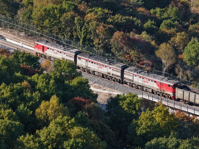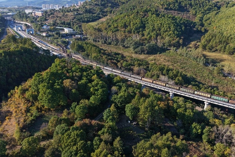 9月27日,滿載大宗品類貨物的入境列車在濱綏鐵路綏芬河至國(guó)境線提質(zhì)改造工程新線路上行駛(無人機(jī)照片)。