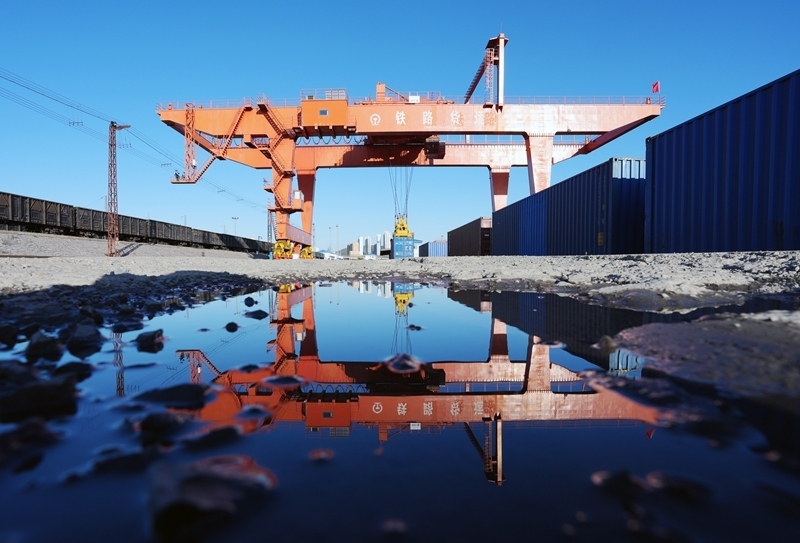 9月27日,在綏芬河站集裝箱換裝場(chǎng),龍門吊在對(duì)回程中歐班列進(jìn)行換裝作業(yè)。