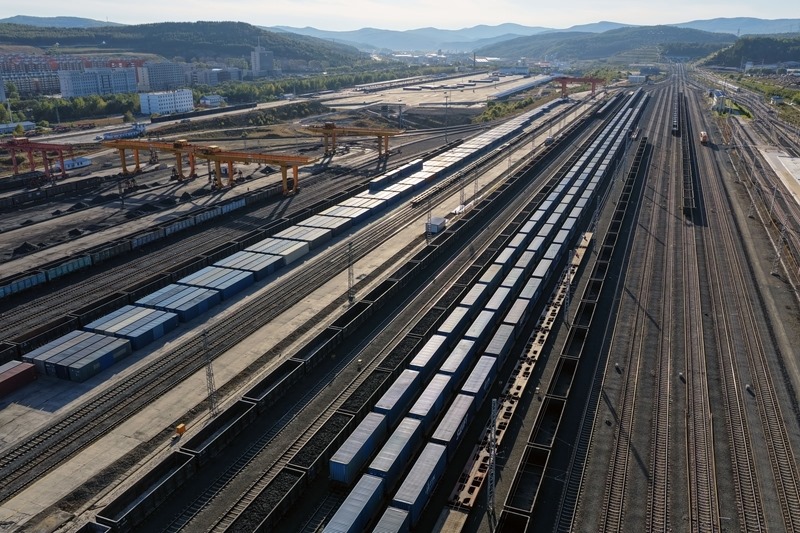 9月27日,滿載貨物的列車在綏芬河站北場(chǎng)進(jìn)行換裝作業(yè)(無人機(jī)照片)。