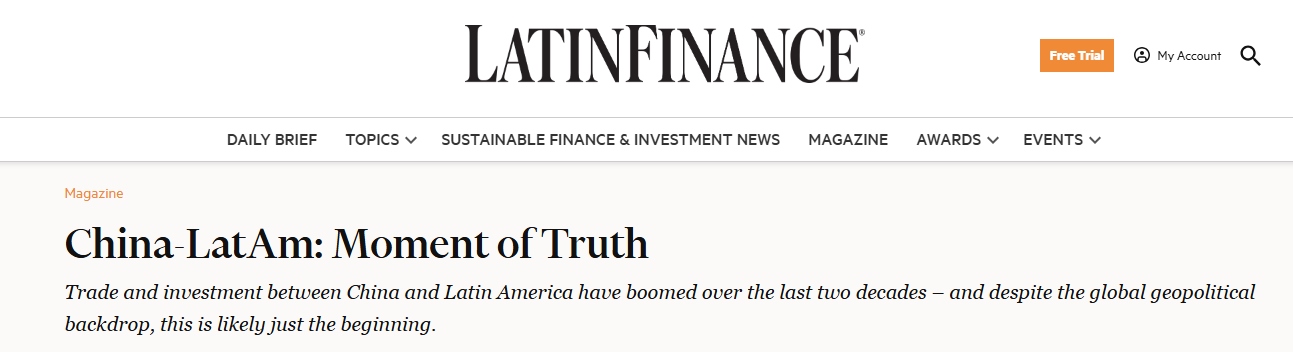 長期關注拉美及加勒比地區(qū)發(fā)展的《拉美金融》雜志最近的一篇文章,聚焦了過去二十年拉丁美洲與中國之間貿(mào)易和投資的蓬勃發(fā)展。文章指出,盡管當前全球地緣政治形勢復雜,但拉美與中國這種良好的發(fā)展勢頭可能僅僅是雙方合作的開端。
