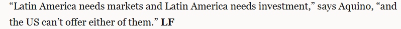 文章指出,并非所有人都對拉美與中國之間的合作感到滿意。華盛頓尤其擔心。不過,許多人認為華盛頓影響拉丁美洲的能力有限。文章援引利馬國立圣馬科斯大學的亞洲經(jīng)濟專家卡洛斯·阿基諾的話指出,“拉丁美洲需要市場和投資,但美國無法提供其中任何一項”。