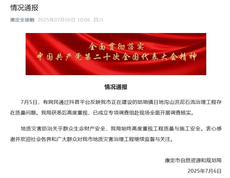 中新網(wǎng)7月6日電 據(jù)“康定全接觸”微信公眾號(hào)消息,7月5日,有網(wǎng)民通過(guò)抖音平臺(tái)反映四川省康定市正在建設(shè)的姑咱鎮(zhèn)日地溝山洪泥石流治理工程存在質(zhì)量問(wèn)題??刀ㄊ凶匀毁Y源和規(guī)劃局獲悉后高度重視,已成立專項(xiàng)調(diào)查組赴現(xiàn)場(chǎng)全面開(kāi)展調(diào)查核實(shí)。