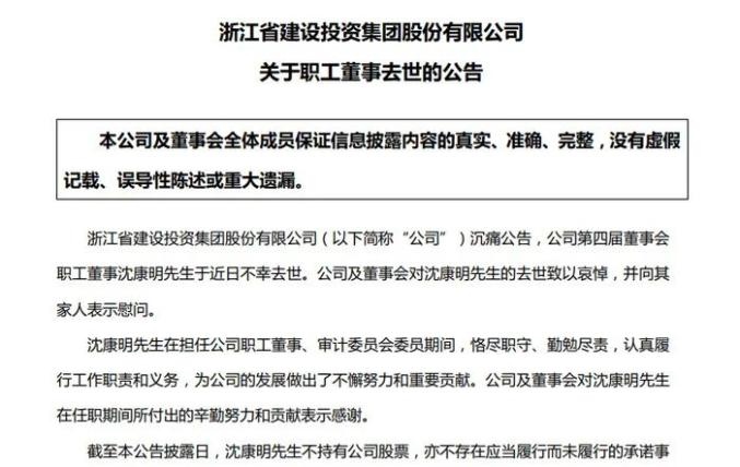 浙江省建設投資集團股份有限公司(下稱“浙江建投”)(002761.SZ)于7月3日公告稱,集團職工董事沈康明于近日不幸去世,年僅54歲。