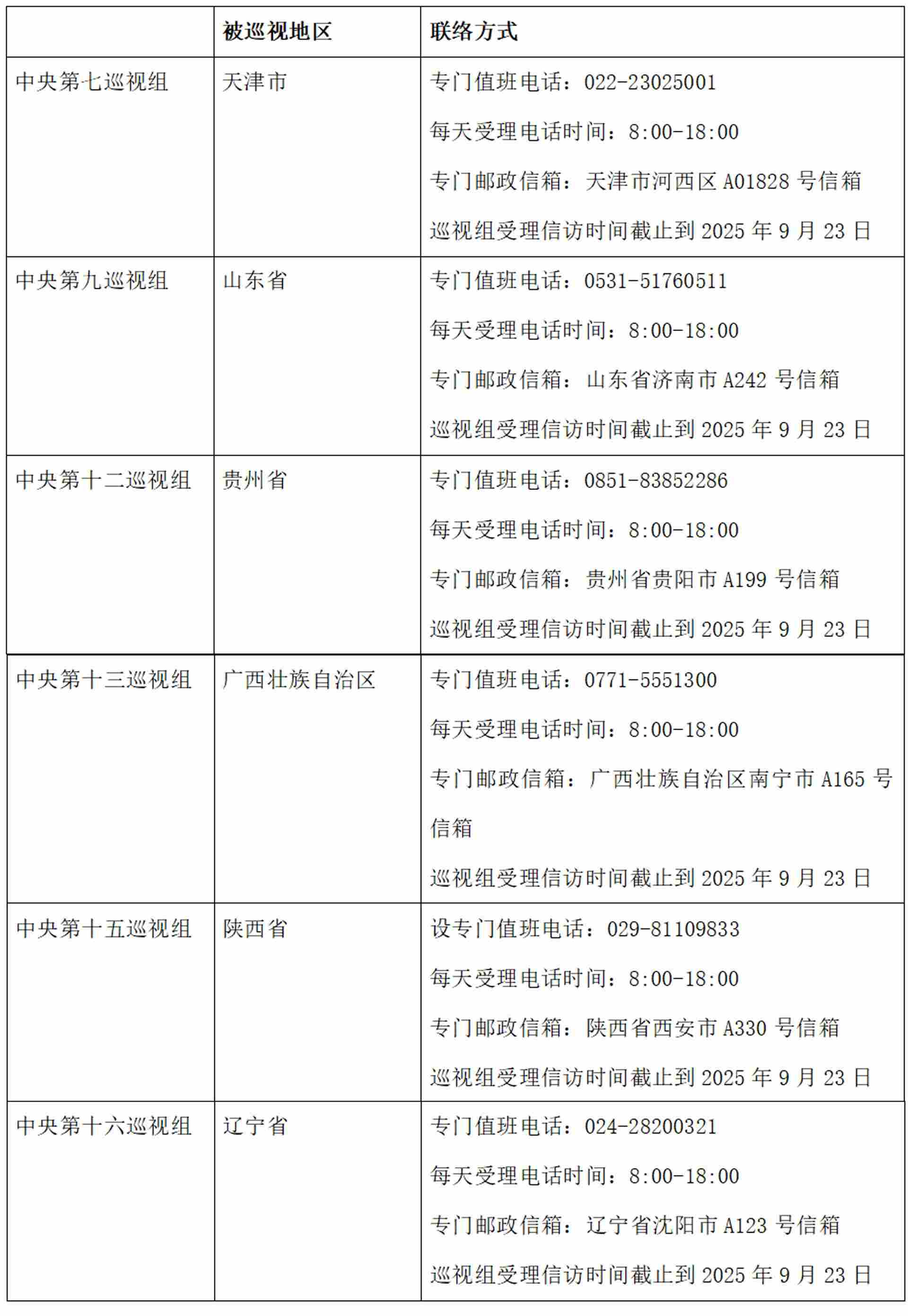 根據(jù)黨中央關于巡視工作的統(tǒng)一部署,近日,二十屆中央第六輪巡視的16個巡視組陸續(xù)開始進駐被巡視地區(qū),并公布了聯(lián)系方式。