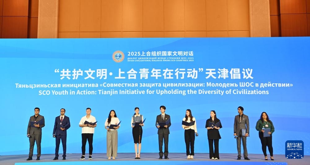 7月23日在2025上合組織國家文明對話現(xiàn)場拍攝的“共護(hù)文明·上合青年在行動”天津倡議發(fā)布環(huán)節(jié)。新華社記者 李然 攝