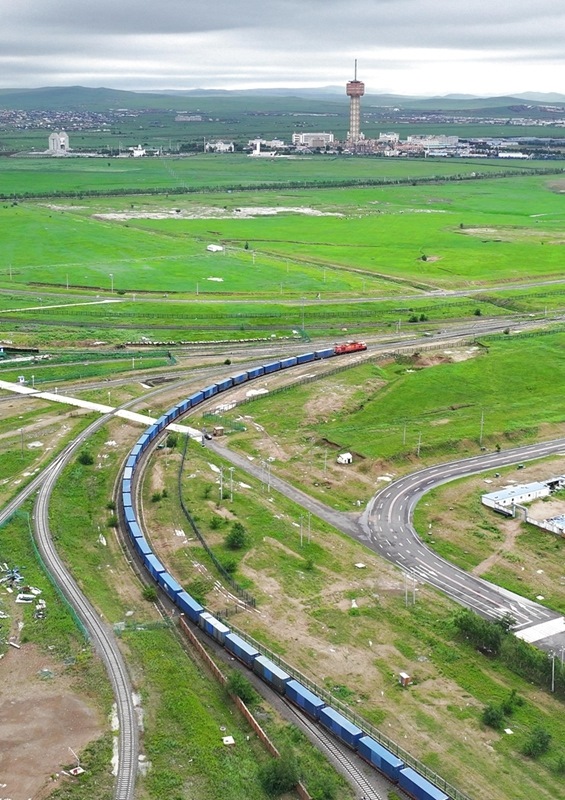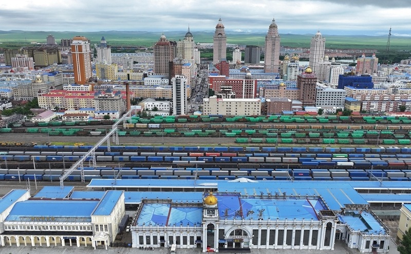 7月24日,一列滿載貨物的中歐班列從中國(guó)鐵路哈爾濱局集團(tuán)有限公司滿洲里站駛出國(guó)門(無人機(jī)照片)。