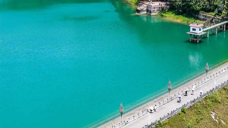 7月30日,游客在瑤池公園棧道上漫步(無人機照片)。