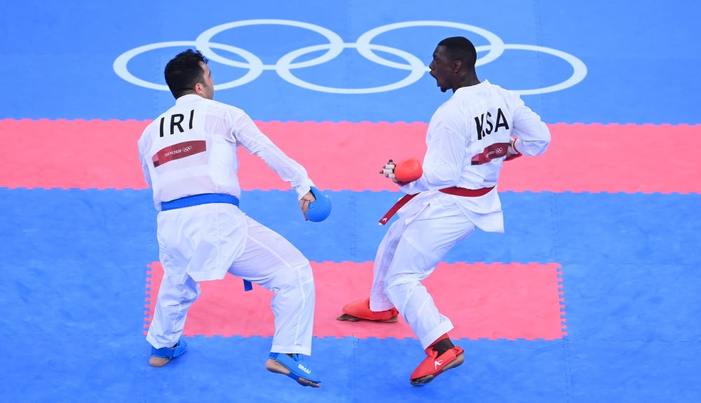 空手道作為“新增項(xiàng)目”之一進(jìn)入了東京奧運(yùn)會(huì),但未能在巴黎奧運(yùn)會(huì)上繼續(xù)入圍。圖為東京奧運(yùn)會(huì),伊朗選手薩賈德(左)與沙特選手哈米迪在空手道比賽中。黃宗治 攝