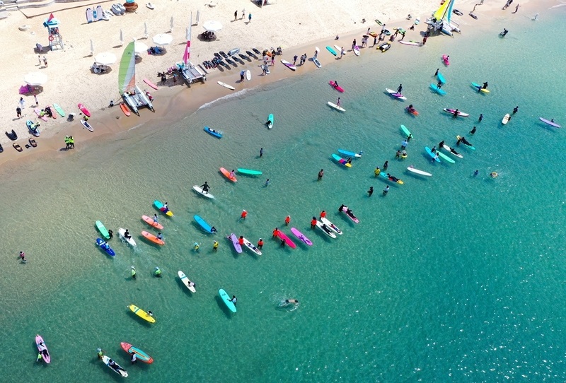 8月9日,游客在三亞市后海村附近海域沖浪嬉水(無(wú)人機(jī)照片)。