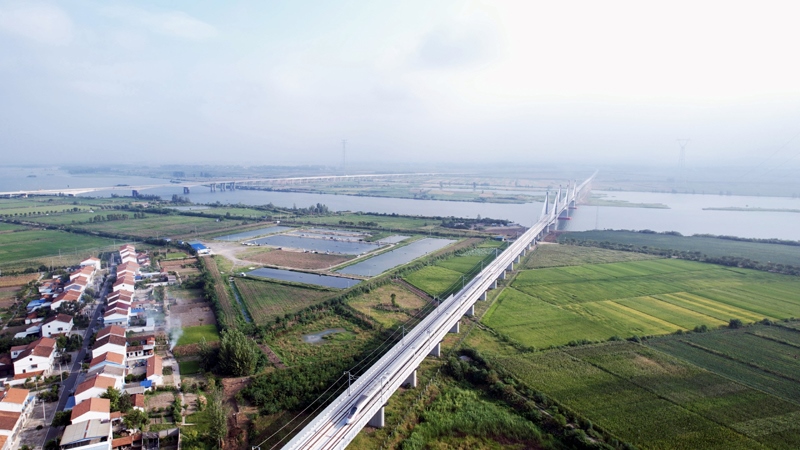 8月23日,試驗(yàn)列車通過(guò)襄荊高鐵宜城漢江特大橋(無(wú)人機(jī)照片)。