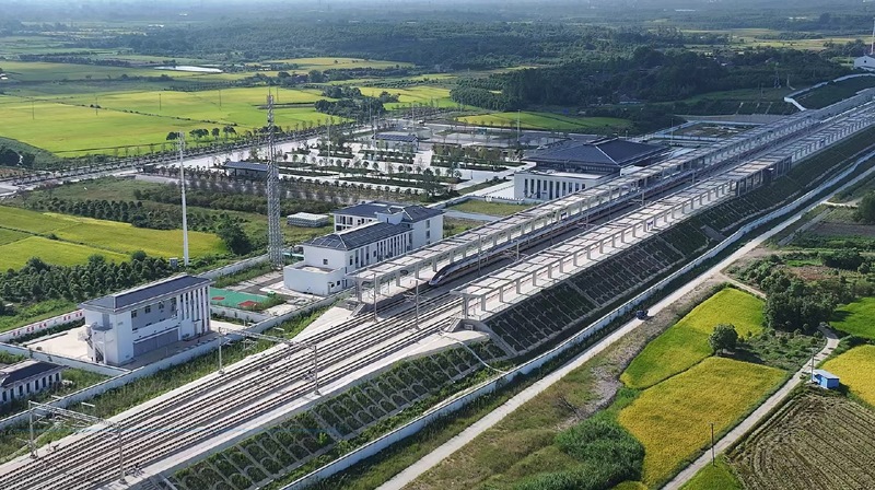 8月23日,試驗(yàn)列車從荊門(mén)市沙洋西站折返,駛向襄陽(yáng)東站(無(wú)人機(jī)照片)。