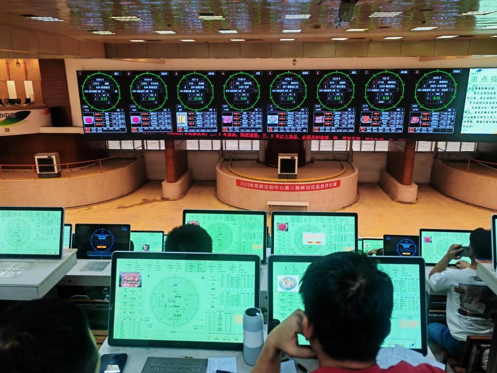 記者在昆明國際花卉拍賣交易中心看到,拍賣大鐘界面顯示著各種花卉的信息,數(shù)百名購買商操作著競(jìng)價(jià)器選購鮮花。昆明國際花卉拍賣交易中心副總經(jīng)理汪洋介紹,這里每天的鮮花交易量都超700萬枝,單日最高交易量超1100萬枝,30%以上的鮮花被各大電商和直播團(tuán)隊(duì)拍下,他們?cè)倌玫诫娚唐脚_(tái)或直播間銷售。