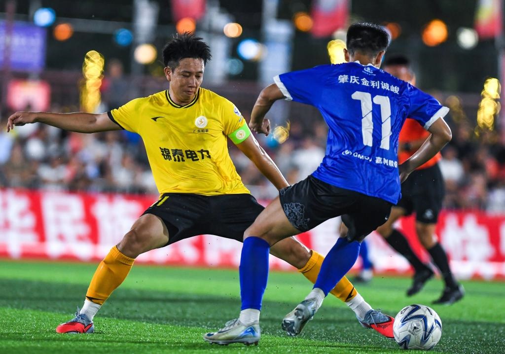 8月23日,廣東和平商會(huì)足球隊(duì)球員陳宇(左)與廣東肇慶金利誠(chéng)峻足球隊(duì)球員陳開(kāi)樂(lè)在比賽中。新華社記者 楊文斌 攝