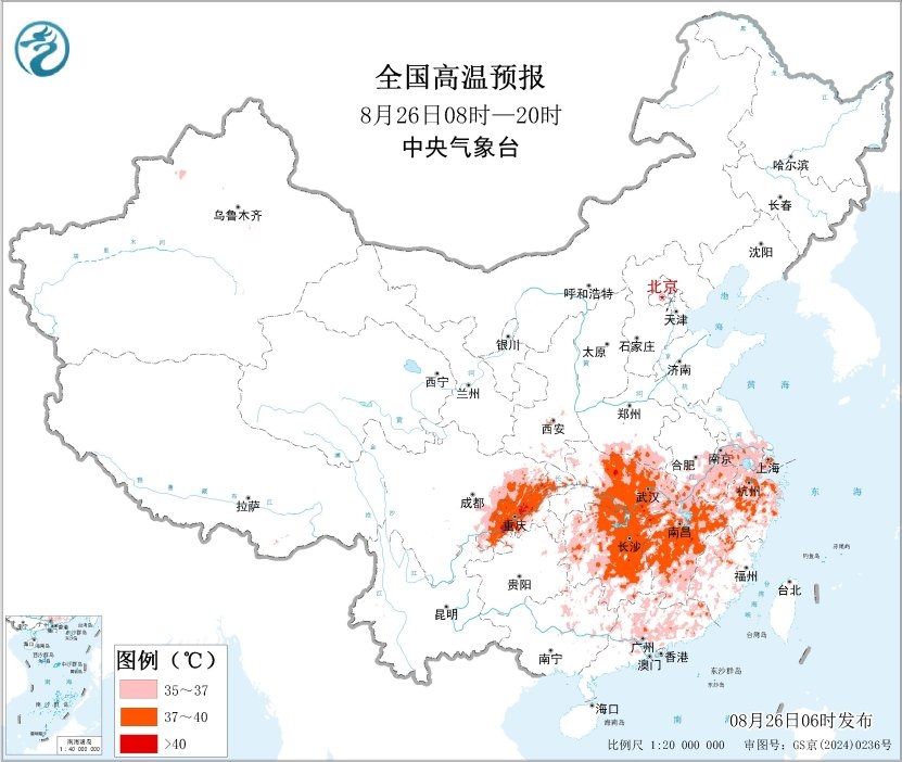 預(yù)計8月26日白天,四川東部、重慶、河南南部、湖北大部、湖南、江西、安徽中南部、江蘇南部、浙江、上海、福建大部、廣東北部、廣西北部以及新疆吐魯番盆地等地有35~39℃高溫天氣,其中,重慶中西部、湖北西南部、湖南東北部、江西北部、浙江中西部等地局地最高氣溫可超過40℃。中央氣象臺8月26日06時繼續(xù)發(fā)布高溫黃色預(yù)警。