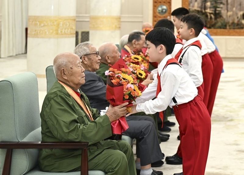 9月3日晚,紀(jì)念中國人民抗日戰(zhàn)爭暨世界反法西斯戰(zhàn)爭勝利80周年文藝晚會(huì)《正義必勝》在北京人民大會(huì)堂隆重舉行。這是晚會(huì)開始前,少先隊(duì)員向前來觀看演出的抗戰(zhàn)老戰(zhàn)士老同志代表獻(xiàn)花。