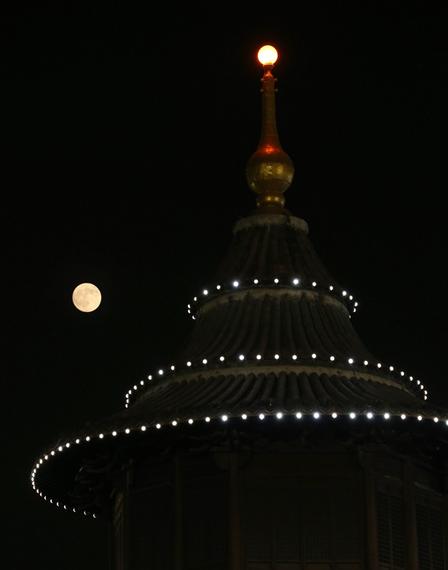 10月6日,一輪圓月與江蘇省揚(yáng)州市文昌閣的燈光相映成趣。