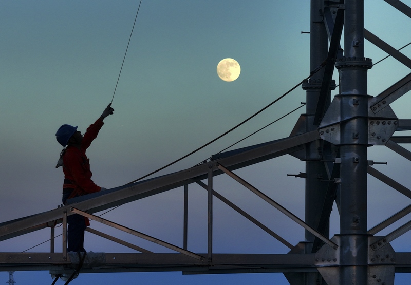 10月6日,在湖南省衡陽(yáng)市雁峰區(qū),高塔架線(xiàn)工人在月光的映射下施工(無(wú)人機(jī)照片)。