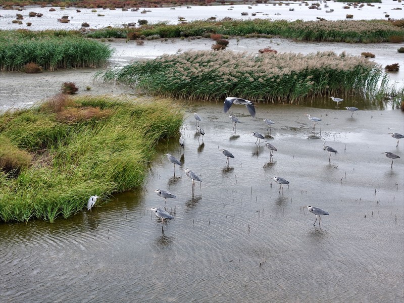10月18日,一群候鳥在江蘇省連云港市海州灣國家級海洋公園濕地棲息、覓食(無人機照片)。