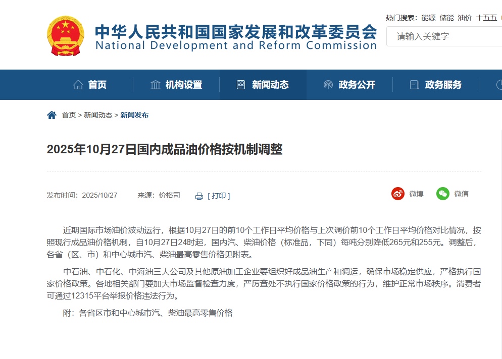 中國網(wǎng)10月27日訊 據(jù)國家發(fā)改委網(wǎng)站消息,近期國際市場油價波動運行,根據(jù)10月27日的前10個工作日平均價格與上次調(diào)價前10個工作日平均價格對比情況,按照現(xiàn)行成品油價格機制,自10月27日24時起,國內(nèi)汽、柴油價格(標準品,下同)每噸分別降低265元和255元。調(diào)整后,各省(區(qū)、市)和中心城市汽、柴油最高零售價格見附表。