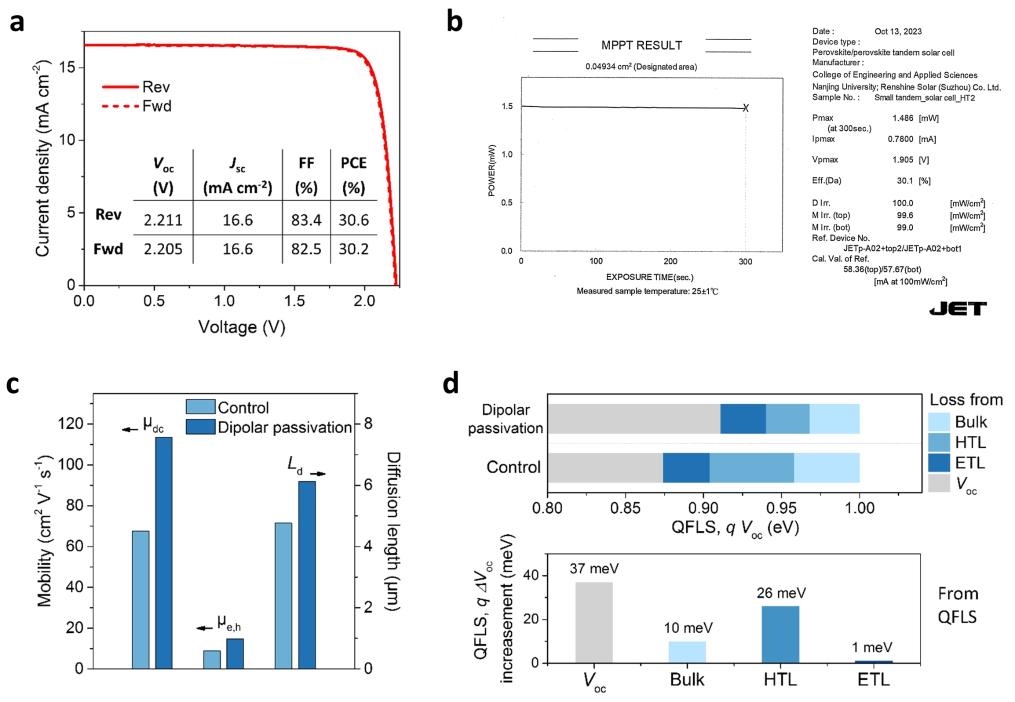此次研究中科研人員發(fā)現(xiàn),鈣鈦礦吸光層和空穴傳輸層之間的界面,是載流子損耗較多的區(qū)域。團隊為此設(shè)計出一種偶極鈍化層,它就像城市里的單行道,一頭連著鈣鈦礦吸光層,一頭連著空穴傳輸層,驅(qū)使載流子向空穴傳輸層運動。