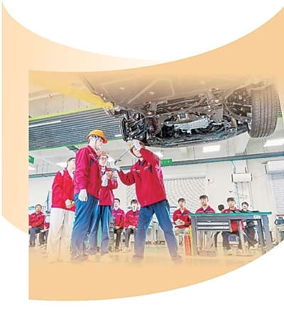 山東水利技師學(xué)院實訓(xùn)中心,學(xué)生正進行整車維修和保養(yǎng)操作。