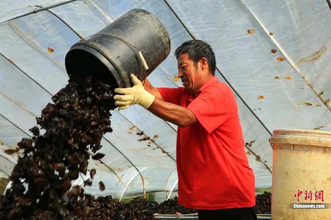 菌農(nóng)們正忙碌地采摘最后一批秋耳