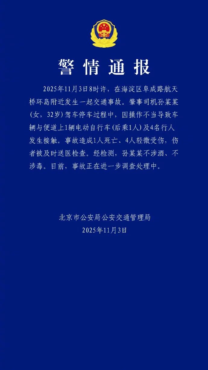 中國網(wǎng)11月3日訊 11月3日,北京交警發(fā)布通報(bào),當(dāng)日8時許,在海淀區(qū)阜成路航天橋環(huán)島附近發(fā)生一起交通事故。肇事司機(jī)孫某某(女,32歲)駕車停車過程中,因操作不當(dāng)導(dǎo)致車輛與便道上1輛電動自行車(后乘1人)及4名行人發(fā)生接觸。事故造成1人死亡、4人輕微受傷,傷者被及時送醫(yī)檢查。經(jīng)檢測,孫某某不涉酒、不涉毒。目前,事故正在進(jìn)一步調(diào)查處理中。
