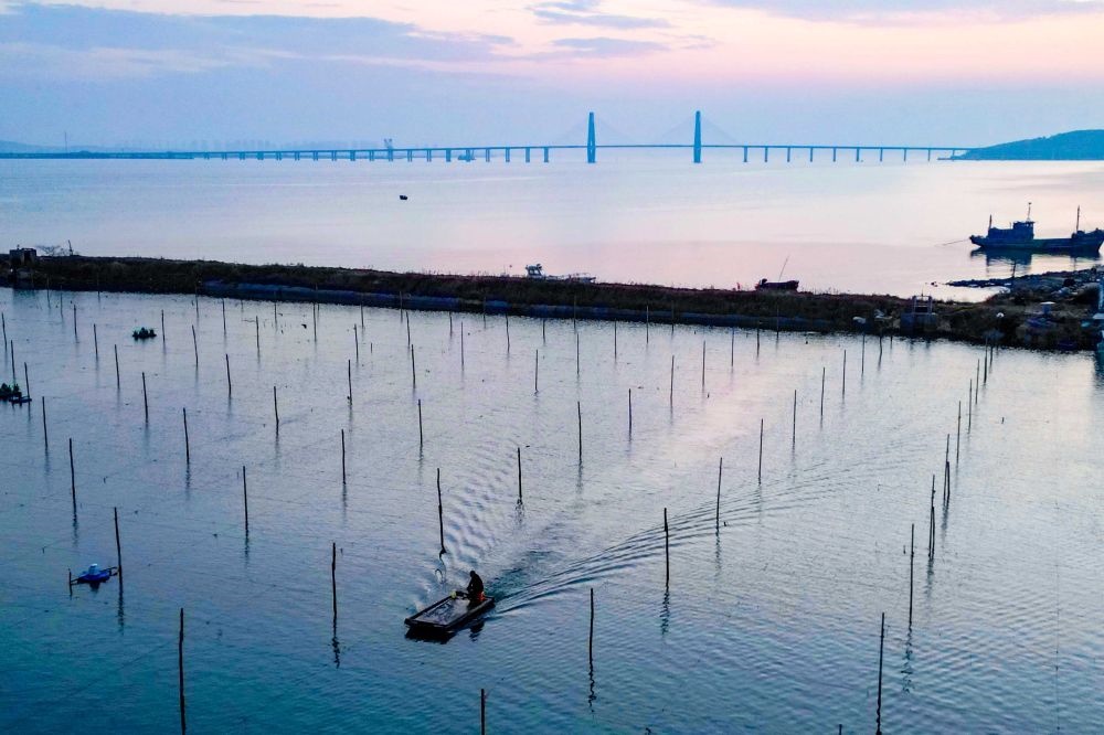 ↑ 11月10日,在山東省榮成市桑溝灣海洋牧場(chǎng),養(yǎng)殖工人在養(yǎng)殖區(qū)穿梭作業(yè)(無(wú)人機(jī)照片)。新華社發(fā)(王福東 攝)