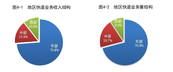 1—10月,東、中、西部地區(qū)快遞業(yè)務(wù)收入比重分別為73.8%、15.6%和10.6%,快遞業(yè)務(wù)量比重分別為70.9%、19.7%和9.4%。與去年同期相比,東部地區(qū)快遞業(yè)務(wù)收入比重下降0.9個百分點(diǎn),快遞業(yè)務(wù)量比重下降1.7個百分點(diǎn);中部地區(qū)快遞業(yè)務(wù)收入比重上升0.6個百分點(diǎn),快遞業(yè)務(wù)量比重上升1.1個百分點(diǎn);西部地區(qū)快遞業(yè)務(wù)收入比重上升0.3個百分點(diǎn),快遞業(yè)務(wù)量比重上升0.6個百分點(diǎn)。