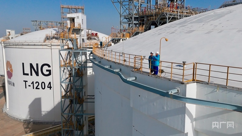 記者和采訪對(duì)象站在20萬立方米的LNG儲(chǔ)罐上(央廣網(wǎng)記者 楊夢(mèng)奎 攝)