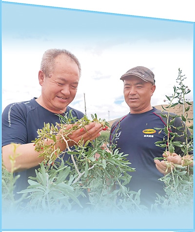 枸杞采摘期,吊堡子村駐村第一書記李宗仁(左)來(lái)到枸杞地里查看枸杞產(chǎn)量情況。